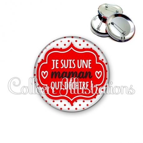 Image imprimée en haute résolution sur papier de qualité, protégée d'un film plastique, et sertie sur une coque et épingle métallique.