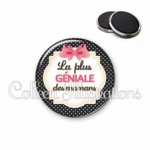 Magnet métallique avec image fantaisie et texte.