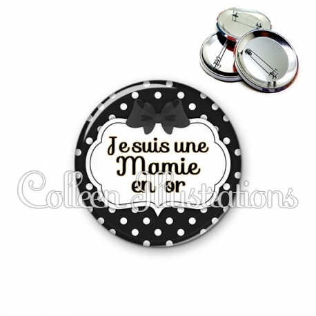 Image imprimée en haute résolution sur papier de qualité, protégée d'un film plastique, et sertie sur une coque et épingle métallique.