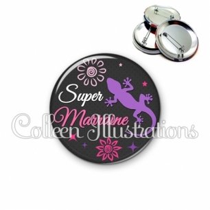 Badge avec image fantaisie et texte et épingle métallique.