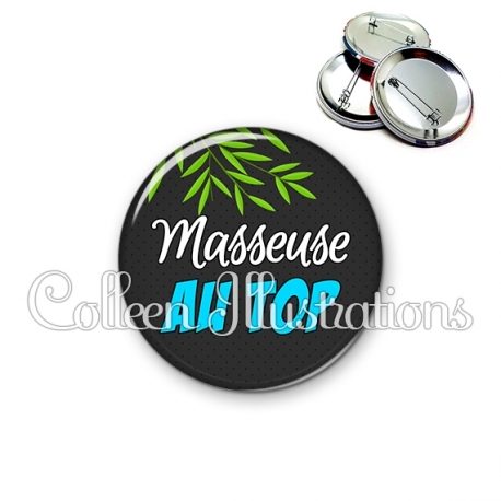 Image imprimée en haute résolution sur papier de qualité, protégée d'un film plastique, et sertie sur une coque et épingle métallique.