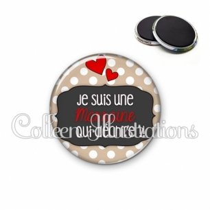 Magnet métallique avec image fantaisie et texte.