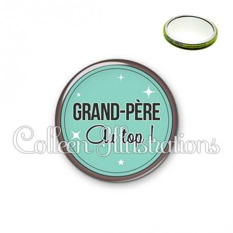 Image imprimée en haute résolution sur papier de qualité, protégée d'un film plastique, et sertie sur une coque métallique avec dos miroir. Une seule face, non grossissante.