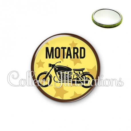 Image imprimée en haute résolution sur papier de qualité, protégée d'un film plastique, et sertie sur une coque métallique avec dos miroir. Une seule face, non grossissante.