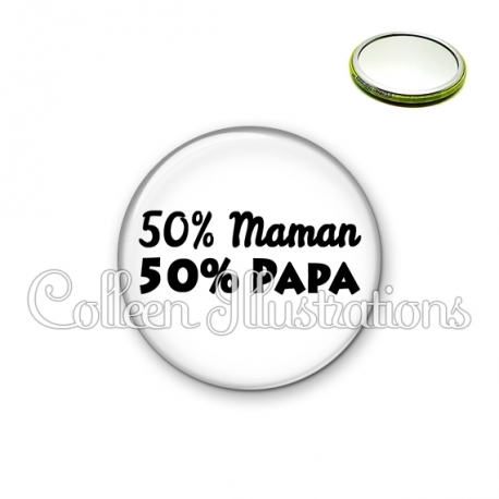 Image imprimée en haute résolution sur papier de qualité, protégée d'un film plastique, et sertie sur une coque métallique avec dos miroir. Une seule face, non grossissante.