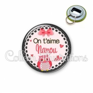 Décapsuleur métallique avec image fantaisie et texte.