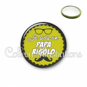 Image imprimée en haute résolution sur papier de qualité, protégée d'un film plastique, et sertie sur une coque métallique avec dos miroir. Une seule face, non grossissante.