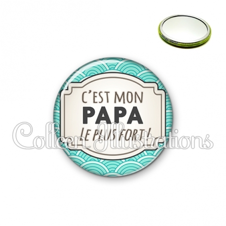 Image imprimée en haute résolution sur papier de qualité, protégée d'un film plastique, et sertie sur une coque métallique avec dos miroir. Une seule face, non grossissante.