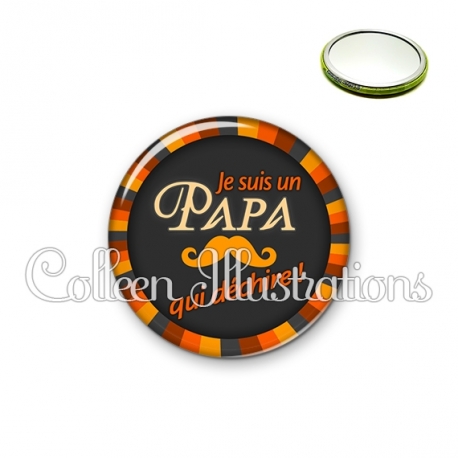 Image imprimée en haute résolution sur papier de qualité, protégée d'un film plastique, et sertie sur une coque métallique avec dos miroir. Une seule face, non grossissante.