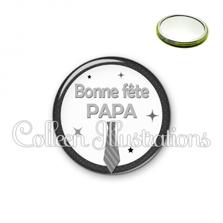 Image imprimée en haute résolution sur papier de qualité, protégée d'un film plastique, et sertie sur une coque métallique avec dos miroir. Une seule face, non grossissante.