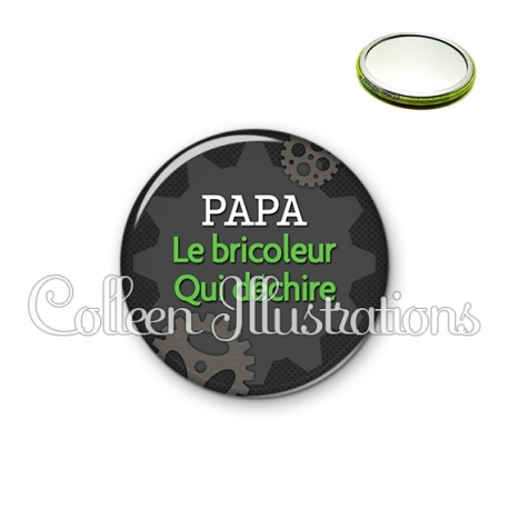 Image imprimée en haute résolution sur papier de qualité, protégée d'un film plastique, et sertie sur une coque métallique avec dos miroir. Une seule face, non grossissante.