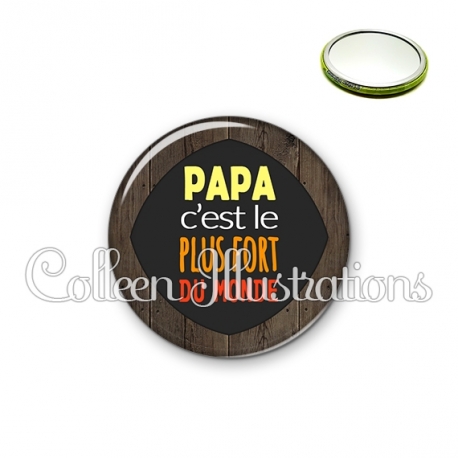 Image imprimée en haute résolution sur papier de qualité, protégée d'un film plastique, et sertie sur une coque métallique avec dos miroir. Une seule face, non grossissante.