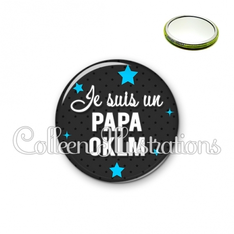 Image imprimée en haute résolution sur papier de qualité, protégée d'un film plastique, et sertie sur une coque métallique avec dos miroir. Une seule face, non grossissante.