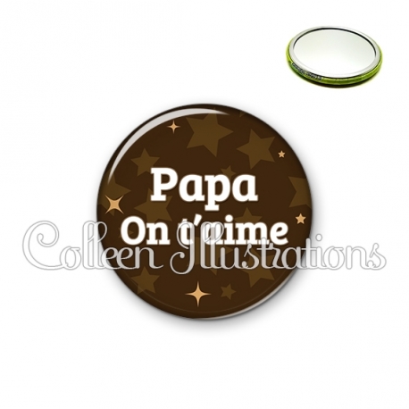 Image imprimée en haute résolution sur papier de qualité, protégée d'un film plastique, et sertie sur une coque métallique avec dos miroir. Une seule face, non grossissante.