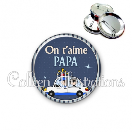 Image imprimée en haute résolution sur papier de qualité, protégée d'un film plastique, et sertie sur une coque et épingle métallique.