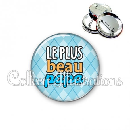 Image imprimée en haute résolution sur papier de qualité, protégée d'un film plastique, et sertie sur une coque et épingle métallique.