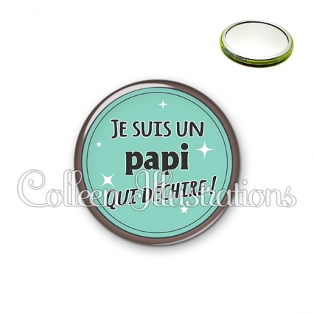 Image imprimée en haute résolution sur papier de qualité, protégée d'un film plastique, et sertie sur une coque métallique avec dos miroir. Une seule face, non grossissante.