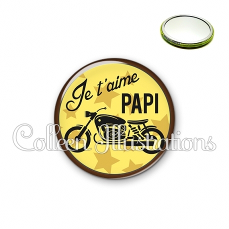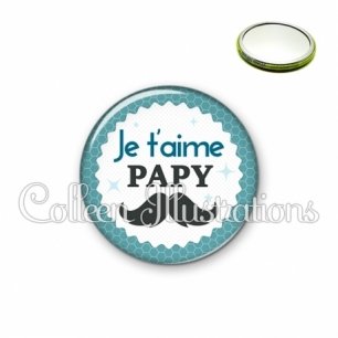 Image imprimée en haute résolution sur papier de qualité, protégée d'un film plastique, et sertie sur une coque métallique avec dos miroir. Une seule face, non grossissante.