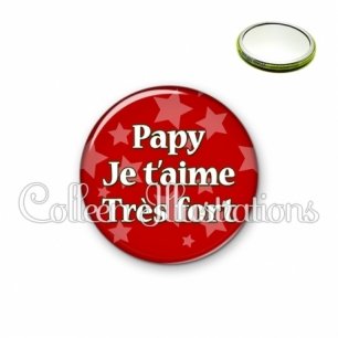 Image imprimée en haute résolution sur papier de qualité, protégée d'un film plastique, et sertie sur une coque métallique avec dos miroir. Une seule face, non grossissante.