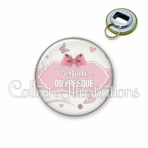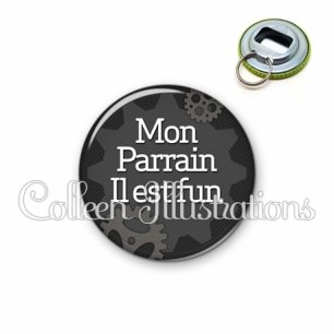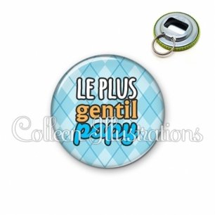 Décapsuleur métallique avec image fantaisie et texte.