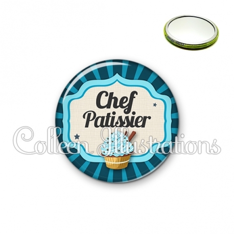 Image imprimée en haute résolution sur papier de qualité, protégée d'un film plastique, et sertie sur une coque métallique avec dos miroir. Une seule face, non grossissante.