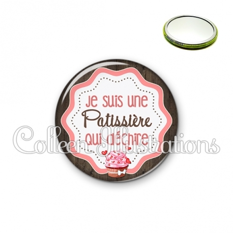 Image imprimée en haute résolution sur papier de qualité, protégée d'un film plastique, et sertie sur une coque métallique avec dos miroir. Une seule face, non grossissante.