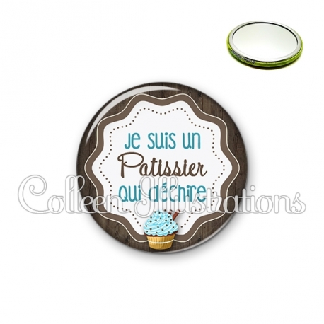 Image imprimée en haute résolution sur papier de qualité, protégée d'un film plastique, et sertie sur une coque métallique avec dos miroir. Une seule face, non grossissante.