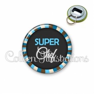 Décapsuleur métallique avec image fantaisie et texte.