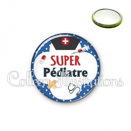 Image imprimée en haute résolution sur papier de qualité, protégée d'un film plastique, et sertie sur une coque métallique avec dos miroir. Une seule face, non grossissante.