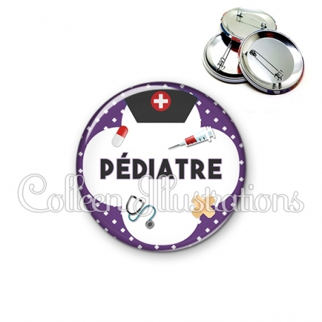 Image imprimée en haute résolution sur papier de qualité, protégée d'un film plastique, et sertie sur une coque et épingle métallique.