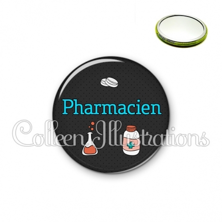 Image imprimée en haute résolution sur papier de qualité, protégée d'un film plastique, et sertie sur une coque métallique avec dos miroir. Une seule face, non grossissante.