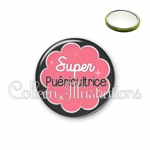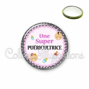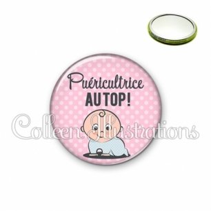 Image imprimée en haute résolution sur papier de qualité, protégée d'un film plastique, et sertie sur une coque métallique avec dos miroir. Une seule face, non grossissante.