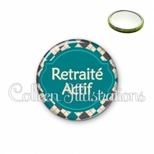 Image imprimée en haute résolution sur papier de qualité, protégée d'un film plastique, et sertie sur une coque métallique avec dos miroir. Une seule face, non grossissante.