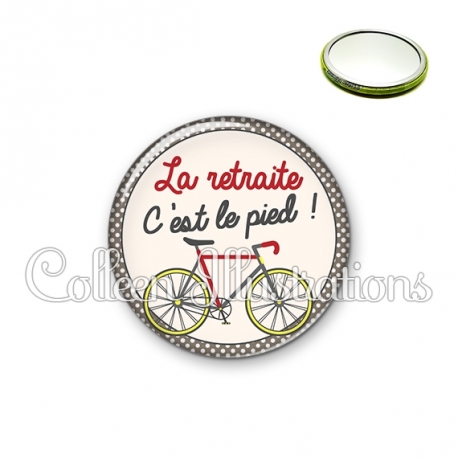 Image imprimée en haute résolution sur papier de qualité, protégée d'un film plastique, et sertie sur une coque métallique avec dos miroir. Une seule face, non grossissante.