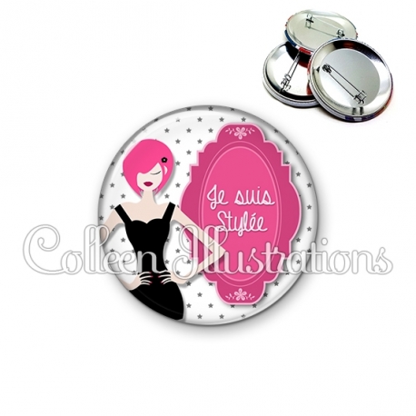 Image imprimée en haute résolution sur papier de qualité, protégée d'un film plastique, et sertie sur une coque et épingle métallique.
