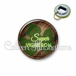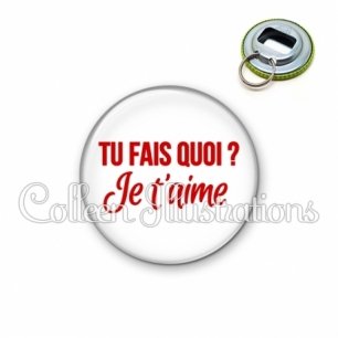 Décapsuleur métallique avec image fantaisie et texte.