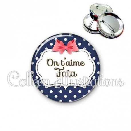 Image imprimée en haute résolution sur papier de qualité, protégée d'un film plastique, et sertie sur une coque et épingle métallique.